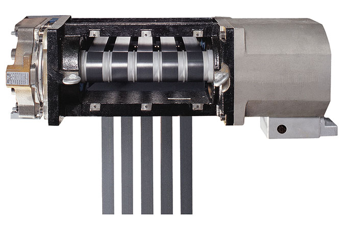 The Gen2 Elevator motor from Otis has a very low-profile motor and sheave that mounts at the top of the hoistway, using flat belts instead of steel ropes.