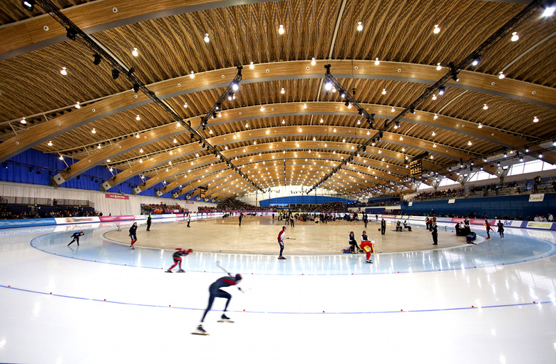 The Richmond Olympic Oval was the site of speed-skating events during the 2010 Vancouver Olympic Games; its ceiling is made from trees killed by the mountain pine beetle and turned into engineered wood.