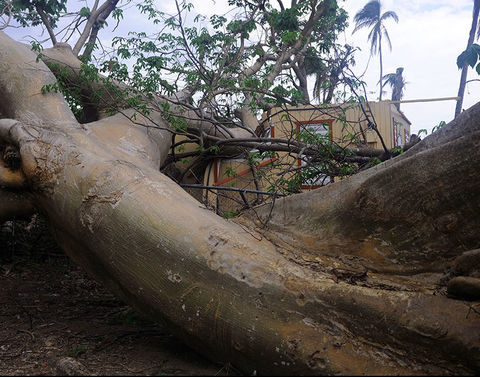 On November 20, 2017—two months after Hurricane Maria struck the island—a large tree remains untouched from where it fell, damaging a home in Loíza, Puerto Rico.