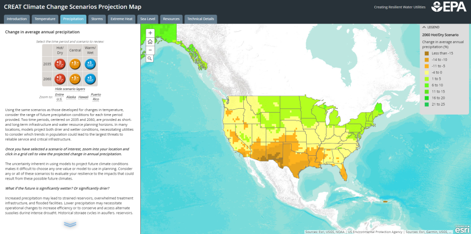The Projected CREAT Climate Scenarios tool pulls up changes in annual temperature, precipitation, and 100-year storm intensity over two 30-year time periods: 2025-2056 and 2035-2066.