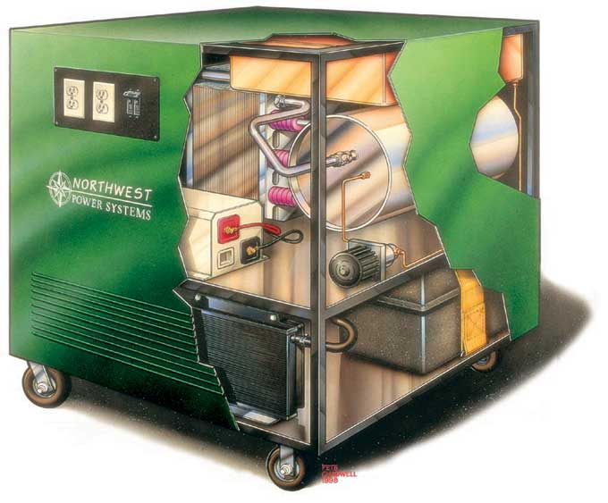 Source: Northwest Power Systems Proton exchange membrane (PEM) fuel cells are the type being researched most widely today. These are also known as solid-polymer fuel cells because the electrolyte is a thin polymer film. PEM fuel cells are considered by DOE to be the leading contender for light-duty vehicles, buildings, and very small applications, such as video camcorder operation. A number of PEM fuel cell prototypes are operating today, including several from Ballard Power Systems that are operating city buses in Vancouver, Canada, and a 7 kW residential system developed and operated by Plug Power in Latham, New York. A handful of other companies are testing PEM fuel cells for residential and light commercial applications. Most are working with units sized to supply about 3 kW continuously, with batteries to provide short term peaks up to 10 kW. PEM fuel cells generate electricity at 35% to 40% efficiency, and operate at 140°F to 212°F (60°C to 100°C). Phosphoric acid fuel cells are the only type in commercial production for building applications today. The ONSI subsidiary of United Technologies, Inc. has sold more than 120 200-kW fuel cells over the past few years. They currently cost about $800,000 each, produce electricity at roughly 40% efficiency, and are up to 85% efficient if the heat is used for cogeneration. Operating temperatures are about 400°F (200°C). Molten carbonate fuel cells operate at high temperatures—about 1,200°F (650°C)—and look promising for large commercial buildings and utility-scale power generation. A nickel catalyst is used, and the electrolyte is a mixture of molten lithium and potassium carbonate. Because of the high temperature and the resistance of the catalyst to poisoning, carbon-based fuels can be internally reformed, obviating the need for a separate fuel processor. The high operating temperatures also provide for the possibility that waste heat can be used for many industrial processes, or to run efficient absorption chillers in commercial buildings. Solid oxide fuel cells use a hard ceramic material instead of a liquid electrolyte. These fuel cells operate at very high temperature—up to 1,800°F (1,000°C)—and are generally considered most appropriate for utility-scale power production. Power generation efficiencies can be as high as 65%. Like molten carbonate fuel cells, the high operating temperature means that readily available fuels can be used directly. This is the least well developed of the five most common fuel cells, but it is considered to offer a lot of potential because of the high efficiency and useful waste heat. Alkali fuel cells satisfy the very small niche of power supply systems for space vehicles. They operate at very high efficiency—up to 70%—and the pure water produced is a benefit for manned space flight. The electrolyte is potassium hydroxide, and a large amount of platinum is required as the catalyst, keeping the cost high. Also, the catalysts used in alkali fuel cells are degraded or poisoned by carbon dioxide and other contaminants, so high-purity hydrogen is needed, which increases operating costs.
