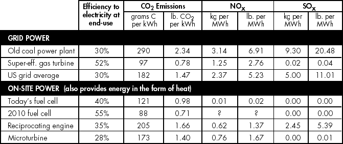 Sources for table: America’s Energy Choices: Technical Appendixes, 1992, Union of Concerned Scientists; “Combined Heat and Power (CHP or Cogeneration) for Saving Energy and Carbon in Commercial Buildings,” Tina Kaarsburg et al., Proceedings, 1998 ACEEE Summer Study on Energy Efficiency in Buildings; “The ONSI PC25 C Fuel Cell Power Plant” E Source Product Profile, March 1996; “Choosing Clean Power: Bringing the Promise of Fuel Cells to New York,” 1997, Natural Resources Defense Council.