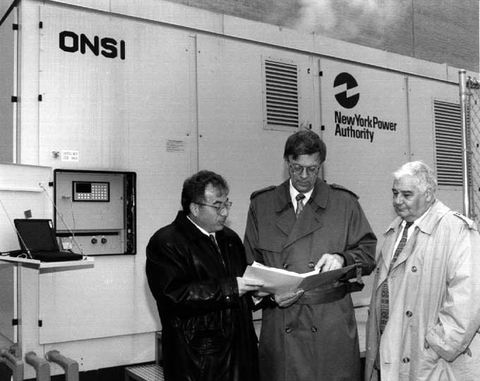 Shalom Zelingher, Eugene Zeltmann, and Robert Tscherne (left to right) of the New York Power Authority study the performance of a PC-25 phosphoric acid fuel cell from ONSI Corporation at the Westchester City Wastewater Treatment Plant.