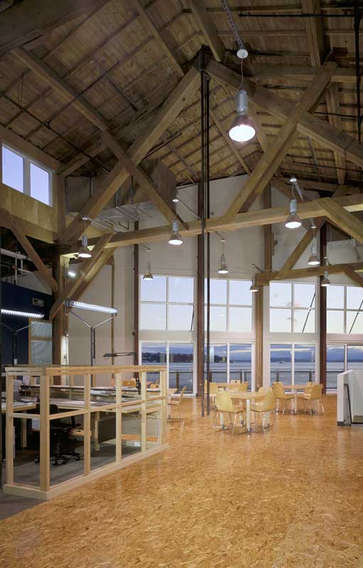 There is a lot packed into this view of the new Mithun office space: renovated structure; dual-function, structure-finish T&G ceiling and OSB floor; clerestory daylighting, and natural ventilation from operable windows and the open floor plan.