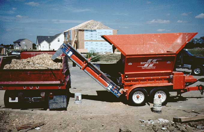 This Shred-All grinder (shown here with a load of construction-site wood chips) is a self-contained mobile unit designed for use on typical residential job sites. Its low-speed, worm-drive auger is well suited to both wood products and scrap drywall.