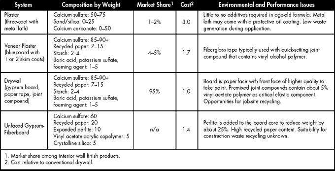 Compositions adapted from U.S. Gypsum Material Safety Data Sheets; market share percentages courtesy of USG; cost comparisons from Northwest Wall and Ceiling Bureau. Table 1 characterizes interior wall surfacing in the United States. While there are a few other approaches for interior building surfaces—for example, solid-sawn and panelized wood products and structure-as-finish systems (see