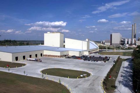 Opened in Wheatfield, Indiana in late 1999, this Georgia-Pacific drywall plant (foreground) was intentionally located right next to a coal-fired power plant generating FGD gypsum. The covered conveyor in the center moves the FGD gypsum from the power plant to the drywall plant.