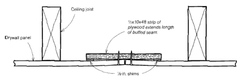 By intentionally running ceiling and wallboard butt joints to a space between framing members, this technique permits the creation of a slight depression to hide the joint. It also can reduce cut-off waste with a little planning on board layout. Myron Ferguson (a professional interior finish contractor) adapted this technique from USG’s Gypsum Construction Handbook and is currently working with a manufacturer on a one-piece accessory of similar design.