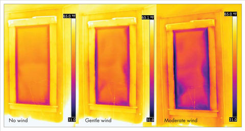 Lawrence Berkeley National Laboratory used infrared (IR) imaging as part of its field testing for ongoing research on the energy performance of window attachments. These three photos show the same window, with an interior low-e panel attached, under three different pressure conditions simulating windy weather. Even with a fairly tightly sealed interior window panel, the moderate wind level significantly increases air leakage. Note that each IR image encompasses the same temperature range—a critical detail when doing side-by-side comparisons.
