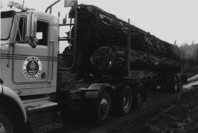 Moving Douglas fir out from Oregon forests. The larger log is about seven feet in diameter at the butt end.