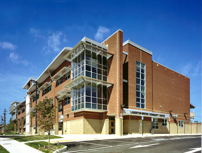 Cooling-load avoidance strategies, like the shades on the southwestern windows of the combined Langston High School and Langston-Brown Community Center in Arlington, Virginia, help maintain livable thermal conditions in a building even when the power goes out.