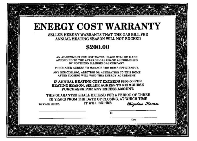 Certificate from Bigelow Homes guaranteeing energy performance. Payment has only been required in one instance.
