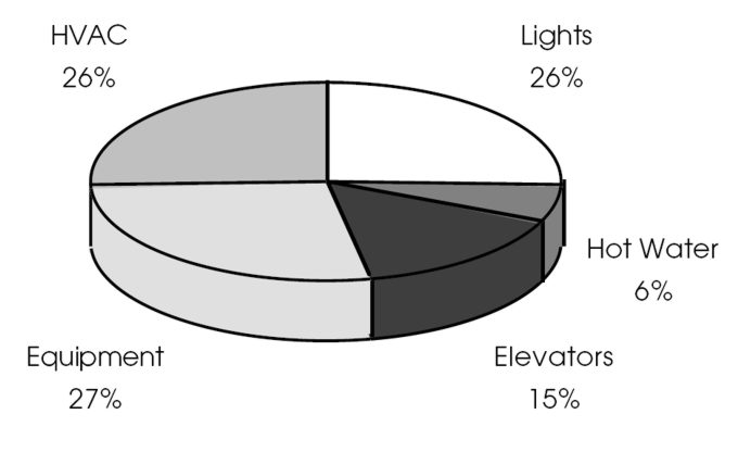 Projected breakdown of energy use in the future Oakland office complex. The performance contract frees the design/build team from responsibility for equipment and elevator loads, and adjusts for hot water use by occupants.