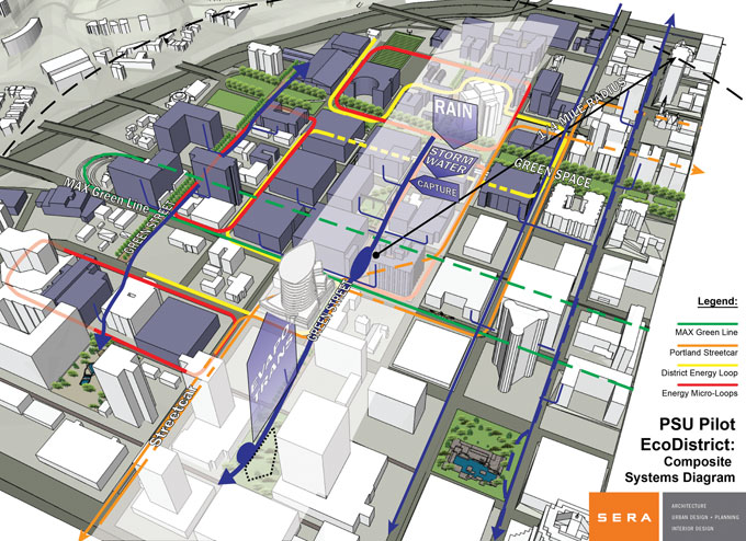 SERA is working with Portland State University as one of five pilot EcoDistricts designated by the Portland Sustainability Institute in a program aimed at removing institutional barriers to creating sustainable neighborhoods. The team is looking at cogeneration, waste-to-energy, lots of heat exchange among the energy strategies they’re hoping will help them get to net-zero.