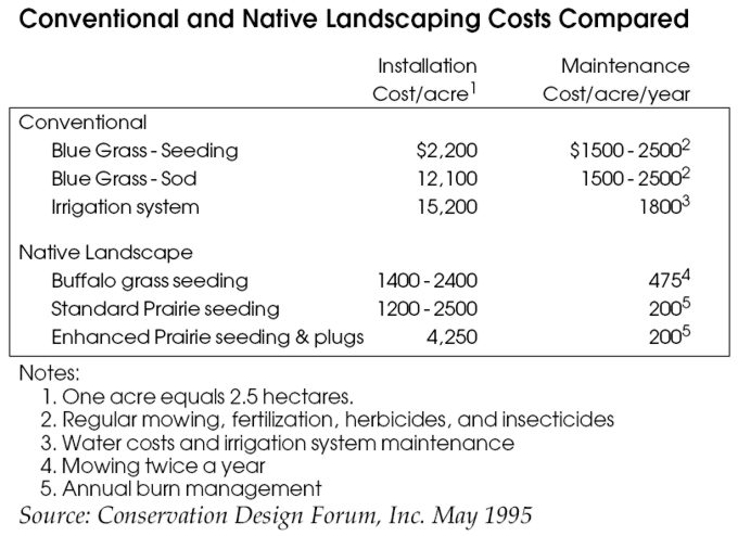 In addition to harming the environment, all the practices mentioned are expensive (see table). Lawnmowing is required periodically throughout the growing season. Irrigation requires a significant initial investment in infrastructure, as well as regular maintenance of the system. Pesticides and fertilizers are expensive, both to purchase and to apply. The high cost for these landscaping practices creates a tremendous opportunity for savings.