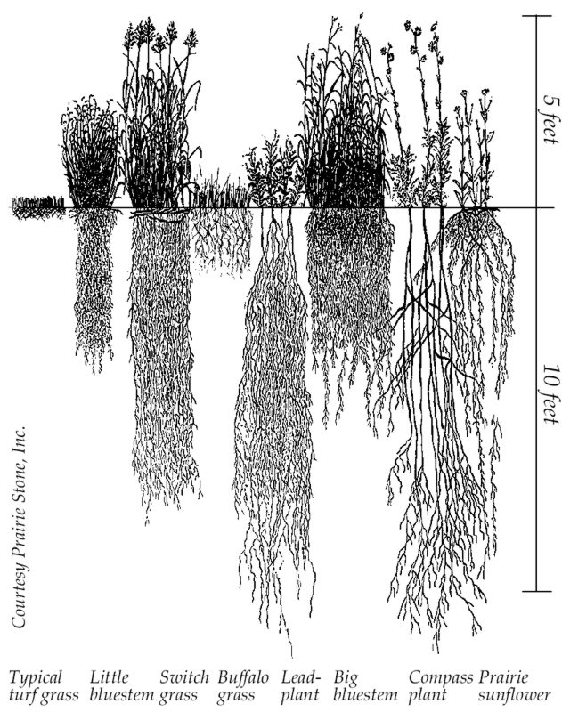 Having evolved over millennia in the area, native species are adapted to the climatic conditions and can thrive without any of the herbicides, insecticides, fertilizers, mowing, or irrigation that traditional landscaping requires. Prairie plants tend to have extremely large root systems—in some cases as much as 90% of the plant mass is below ground. These help to stabilize the soil, help the plant survive dry periods, and contribute to infiltration of surface water deep into the soil. The root systems are also a long-term carbon sink, taking CO2 out of the atmosphere and converting it into biomass.
