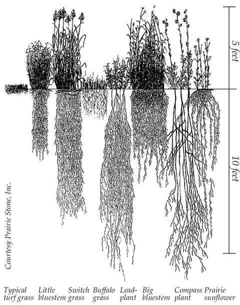 The extensive root systems of native prairie plants are responsible for many of their advantages over conventional turf grass (on left).