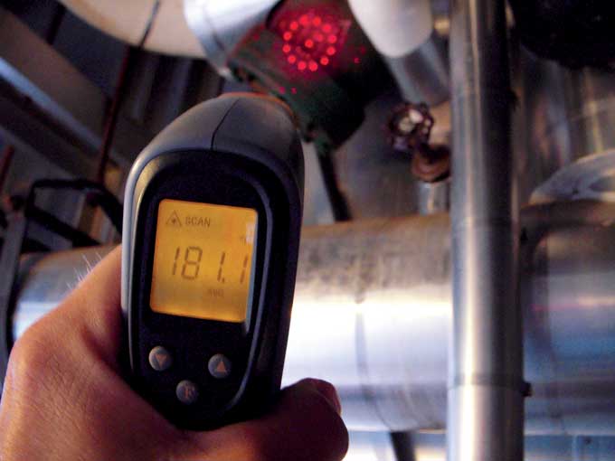 A reading from a non-contact infrared thermometer during a retrocommissioning process shows this steam valve could use some insulation. The temperature should be close to ambient—more than 100ºF cooler than the 181ºF indicated.