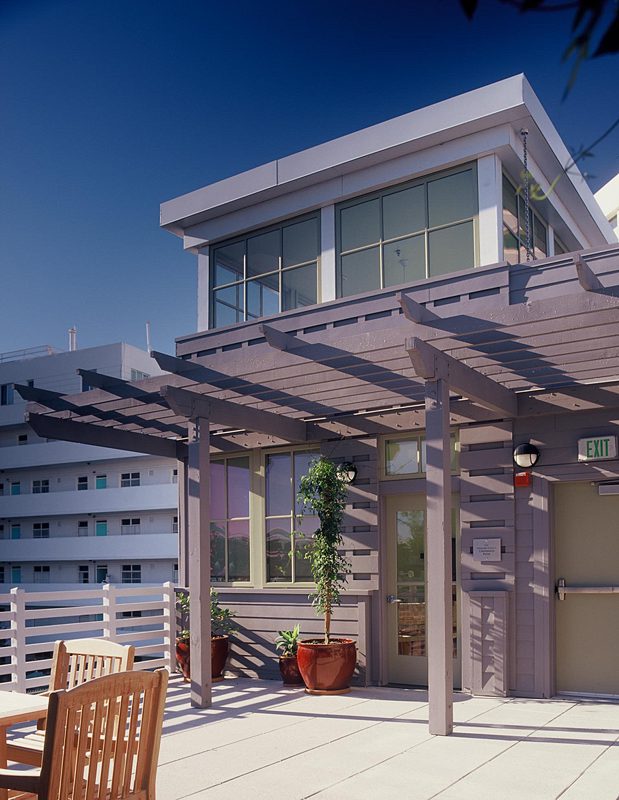 NRDC’s rooftop patio offers views of the Santa Monica Bay. Just inside is a fully equipped kitchen and a set of cabinets salvaged from a movie set.