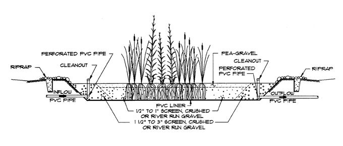 subsurface-flow wetlands are more practical for on-site wastewater treatment. Because water is never at the ground surface, mosquito breeding, odor, and risk of human contact with effluent are effectively eliminated. A typical system is shown in the illustration on page 15. The wetland is one to three feet deep and built with an impervious bottom and sides—usually a plastic pond liner or poured concrete. Effluent from the septic tank is introduced on one side of the wetland through diffusing pipes, and the liquid flows through a layer of clean, washed gravel (1/2" to 1" diameter) in which emergent wetland plants are growing. The most common plants for constructed wetlands are common reed (Phragmites), cattail (Typha), pickerelweed (Pontederia), arrowhead (Sagittaria), and bullrush (Scirpus), but others can be used.