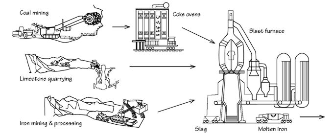 To make steel, iron ore is first processed at the mine into pellets or sinter, increasing the iron concentration. Limestone or other minerals are baked to make lime, and coal is converted to coke. The coking process uses high temperatures in the absence of oxygen to remove volatile organics and other contaminants from the coal. Volatile gases removed from the coal are used to heat the coking ovens and for other processes in the plant. As it emerges from the furnaces, coke is quenched with water, which is then treated and reused or discharged.