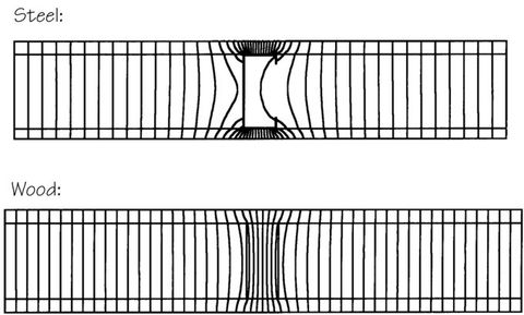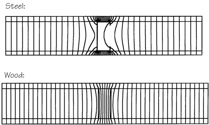 Heat flow lines: Each line represents an equivalent amount of heat flow through the wall. The concentration of heat flow increases slightly around the wood stud, and much more dramatically at the steel stud. The many lines at each side of the steel stud seem to disappear because they all converge (overlap) at the flange.