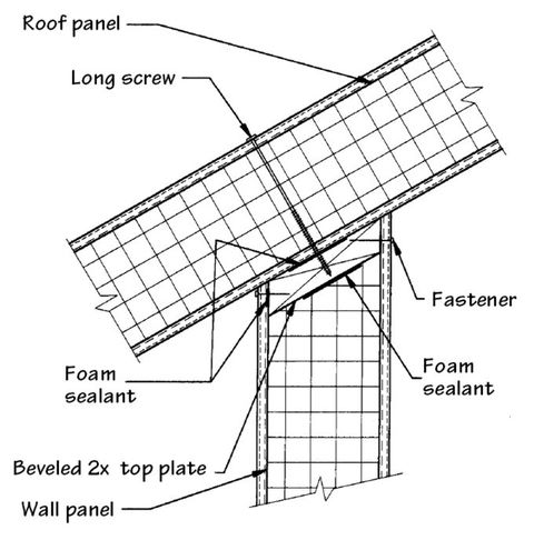 Typical construction practices involve setting pre-routed panels onto sill plates made of standard dimension lumber, and joining panels with plywood splines that fit into pre-routed grooves along the panel edges (see figure). Dimension lumber is also inset into the panels around the perimeter of window and door openings. Manufacturers have devised hundreds of details for supporting floor systems on the face of the panels, supporting structural beams, securing roof panels, building soffit returns, and so forth.