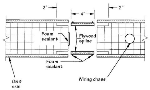 Dual plywood splines are more resource-efficient than the older practice of joining panels with dimension lumber (2x4s, 2x6s, etc.) that extends from inner to outer skin.