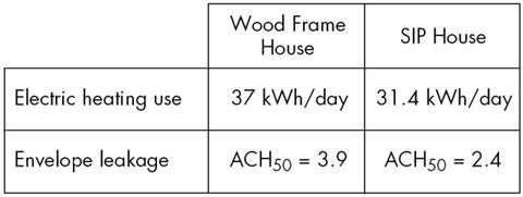 The houses were monitored with “simulated occupancy” prior to families moving in. The SIP house used 15% less electricity for heating and was 38% tighter (see Table 2).