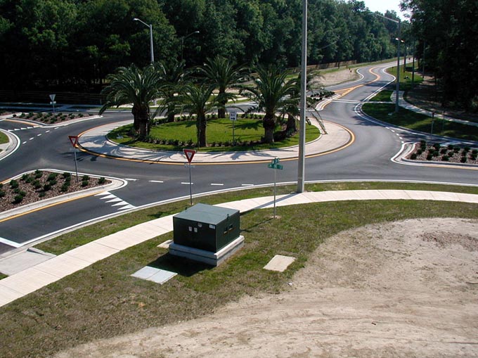 Roundabouts, such as this one in Gainesville, Florida, can be used in place of traffic signals. They reduce travel delays, reduce accidents, and even reduce pollution.