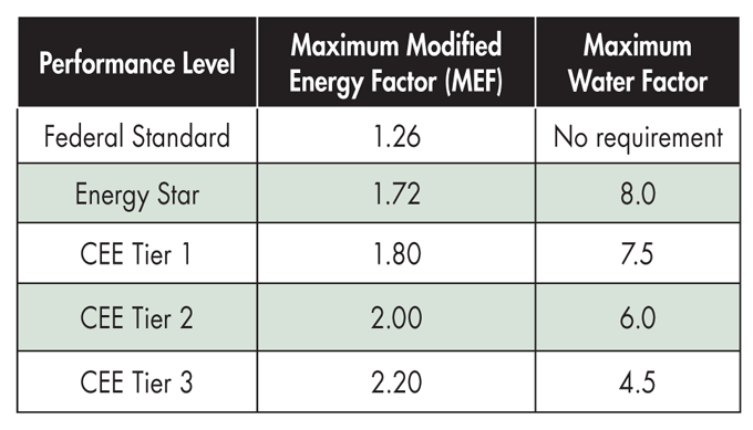 On the horizon: The recently signed Energy Independence and Security Act of 2007 (see 2007 Energy Bill Promotes High-Performance Buildings) establishes, for the first time, a maximum water factor for clothes washers. The legislation establishes a limit of 9.5 gal/ft