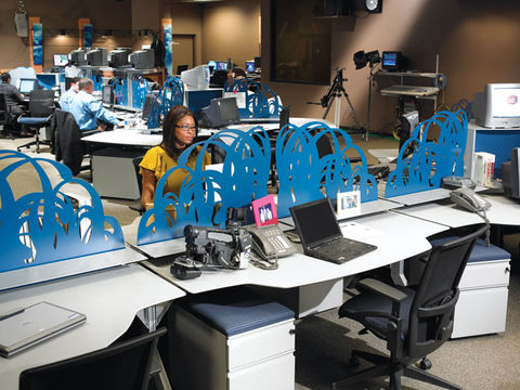 The Hum. Minds at Work furniture from Kimball Office is BIFMA Level 1 and SCS Indoor Advantage Gold certified. According to the company, it is free of PVC and chrome and is designed for disassembly for end-of-life recycling. This installation is at the WXIX, Fox 19 studio in Cincinnati, Ohio.