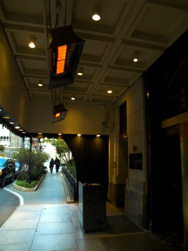 Electric resistance heaters, outside, at the hotel. I guess the towel- and sheet-reuse program makes room for this kind of thing. (Nice place, though.)