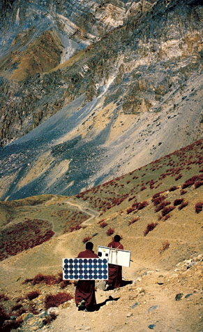 "Tsewang Norbu lives in the village of Digger across the 4,500 meters high Khardungla pass in the Leh District. He is twenty-eight years old, has five children and keeps goats. He was selected by his community to be trained in the installation, repair and maintenance of solar photovoltaic units. All the solar units he installed were brought to the village by Yak and on the backs of people from the village. He was trained on the job: he installed fifty-nine units himself, taking three months to complete the work. The units were installed in 1992. They are still working." Photo by Barefoot Photographers of Tilonia