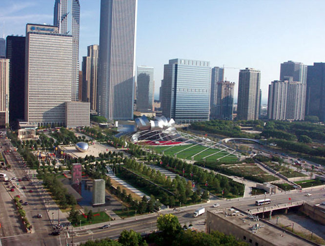 Millennium Park in Chicago, Illinois. At 24.5 acres (1 ha), Millennium Park is perhaps the largest intensive green roof in the world. The project completes the northwest corner of the 320-acre (130 ha) historic Grant Park in downtown Chicago and covers two parking garages, a transit center, and an indoor performance theater.