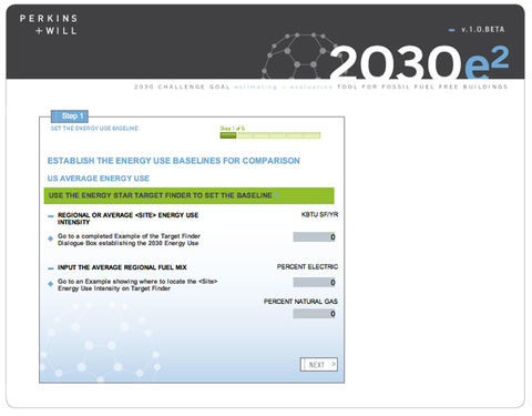 Architecture firm Perkins+Will has made publicly available a tool developed to help project teams set building energy goals that meet the benchmarks of the 2030 Challenge (see EBN June 2007). Originally developed for in-house use, the 2030 e² estimating tool takes the user through a six-step process to set goals for energy efficiency, onsite renewable energy, grid-supplied renewable energy, and renewable energy offsets.