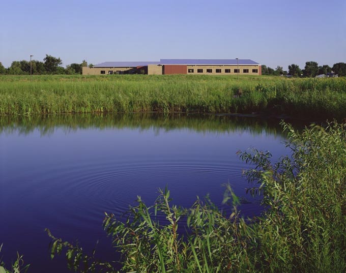 This office building and training headquarters is energy-efficient and cost-effective. Landscaping includes a restored native Iowa tall-grass prairie, wetlands, and siltation pond.