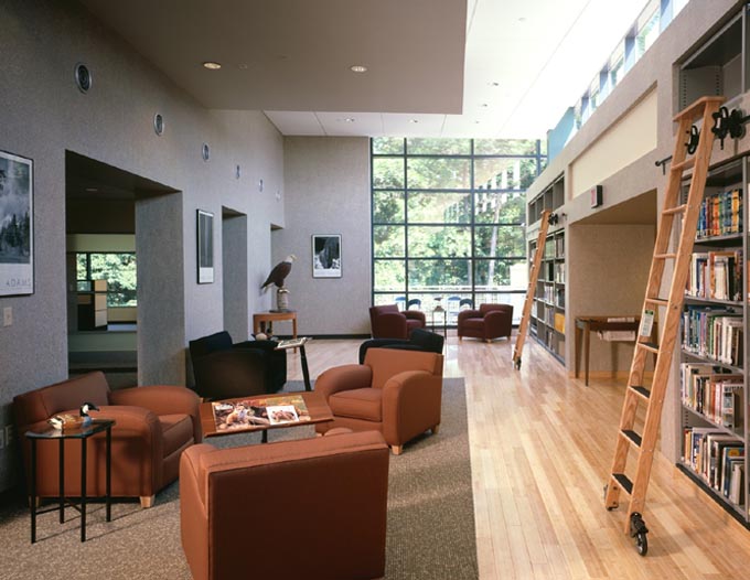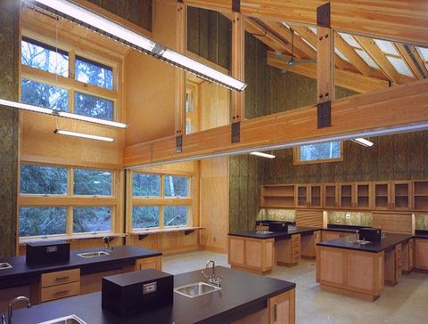 Designed as a teaching tool, the Lewis Center features extensive daylighting and natural ventilation. PV panels provide energy for the Center and a biological wastewater system treats sewage on-site for reuse in the building. Material choices include VOC-free paints and FSC-certified wood. Native landscaping includes an orchard and a created wetland.