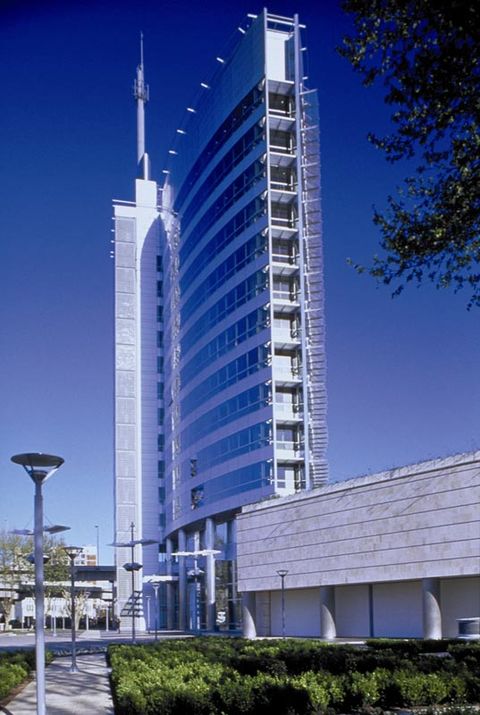This office building, built on a brownfield site in Buenos Aires, employs numerous energy-efficient strategies. The building is long and narrow, with tapered west and east ends, minimizing solar gain and allowing the northern face (the primary solar exposure in the southern hemisphere) to track the sun. Its green roof provides insulation and captures stormwater.
