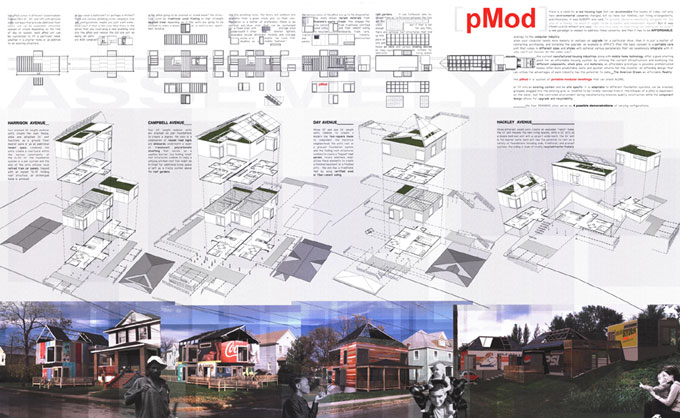 pMod, designed by Sean Wheeler and Jason Zawitkowski, is a system of premanufactured dwellings that can stand alone or be stacked or grouped.
