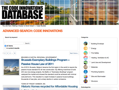 The case studies cover two types of innovation: projects that have successfully stretched or changed building codes, and policy and code updates that encourage green building. Users can filter by green building attributes (energy, materials, land use, etc.) or can search by keyword to find relevant case studies.