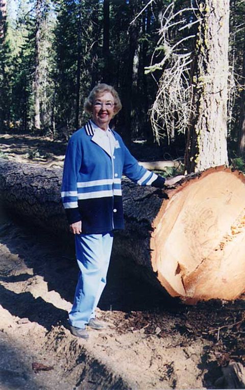 Maribeth Collins, chair of the board of The Collins Companies, stands next to a just-felled 126-year-old ponderosa pineāthe ceremonial tree containing the 2 billionth board foot harvested from the Collins Almanor Forest.