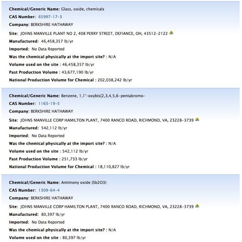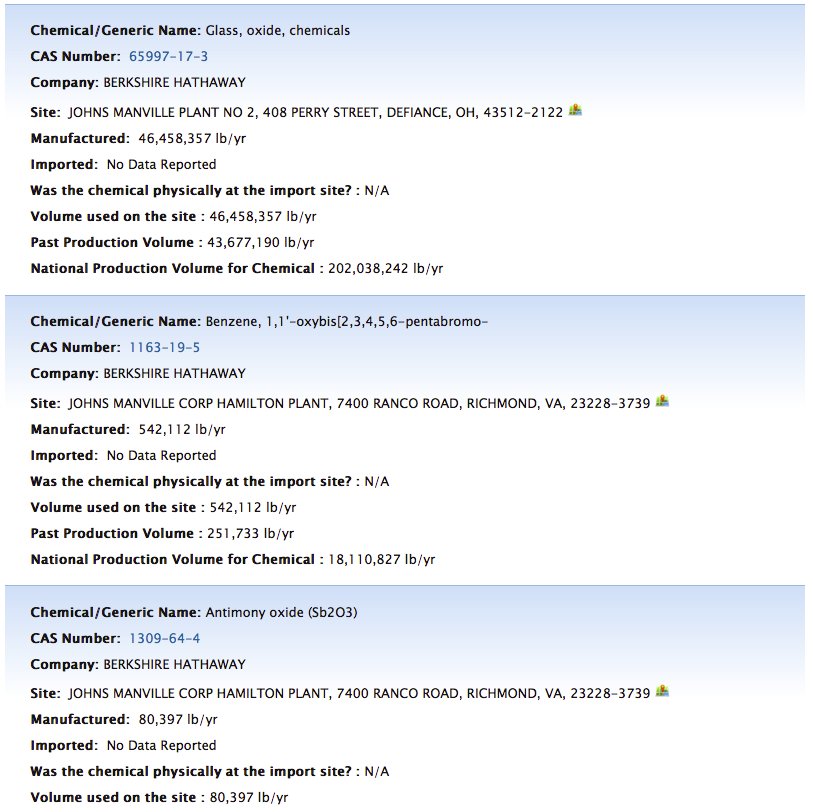 This screen capture from the online version of the database shows both innocuous and less innocuous chemicals used at a specific Johns Manville manufacturing site, where both insulation and paper are made.