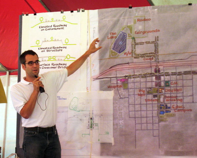 Stephen Hardy, associate of BNIM Architects and project leader for Greensburg’s master plan, presents sustainable rebuilding objectives to the community. Greensburg is the first city in the U.S. requiring that all city-owned buildings meet LEED Platinum standards.