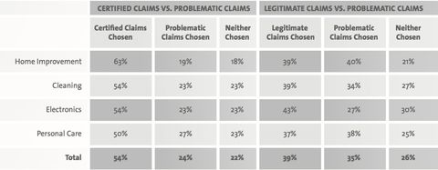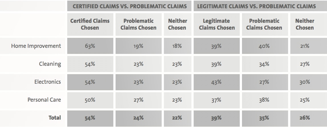 The picture shows that people largely get it: given the choice between a product with a green claim that has been certified by a third party and one with a problematic claim (defined as not meeting the standards set by the U.S. Federal Trade Commission), problematic claims were preferred only 22% of the time. Consumers were less able to distinguish, however, between legitimate claims and problematic claims, and in the category of building products, one problematic claim—a manufacturer-created label promoting a “clean air formula”—beat out third-party certifications in rankings of importance and reliability.