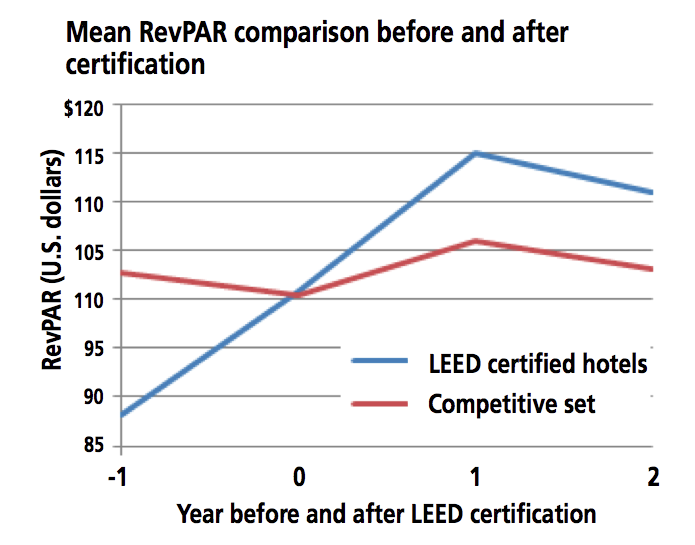 Revenue per available room (RevPAR) figures show LEED-certified hotels quickly make up for lower occupancy rates prior to certification and continue to outpace their competitors.Hotel Revenue Boost from LEED Certification
