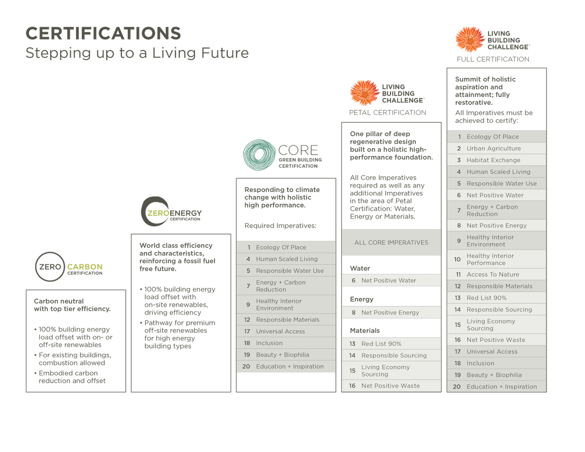 This diagram shows all the International Living Future Institute certifications, including the new Core standard, which now forms the basis of both Petal and Living certification.