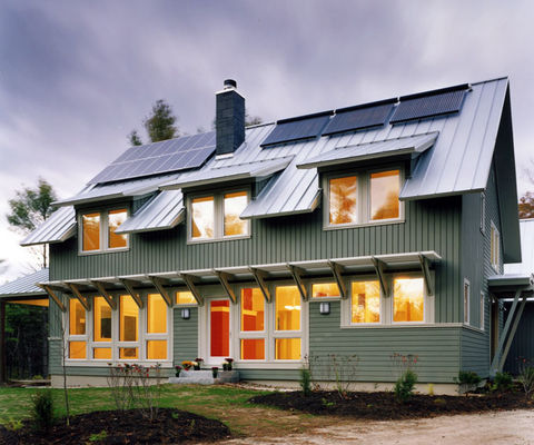 Photo: Bernard C. Meyers A four-bedroom house in Freeport, Maine, is the first in the Northeast and third in the nation to achieve a Platinum rating in the LEED for Homes pilot rating system from the U.S. Green Building Council. The 3,200-ft2 (300-m2) home was designed by Richard Renner Architects and built by Wright Ryan Construction, both of Portland, Maine. It earned 95 out of 129 possible LEED points with its high-performance building envelope, passive and active solar systems, triple-glazed windows, heat-recovery ventilation, recycled-content metal roofing, sustainably harvested wood, and local materials. Despite the heating demands of Maine winters, the house is expected to use 50% less energy than a comparable conventional home under the Energy Star Home Energy Rating System (HERS) and use almost no potable water to irrigate its native landscaping.