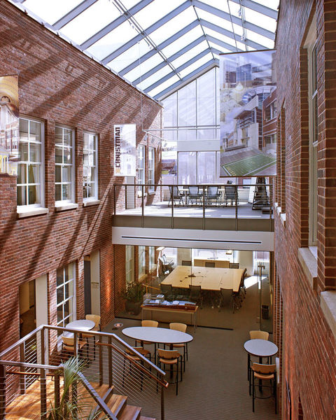 A large atrium in the renovated Christman Building in Lansing, Michigan, brings daylight into several offices. The building was renovated in accordance with standards for historic buildings, and achieved LEED Platinum.