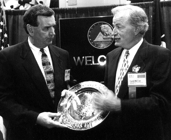 David Barram (right), administrator of the General Services Adminstration, presents the first Evergreen Award to Charlie Ball of Milliken Carpet in recognition of Milliken’s Earth Square renewable carpet program.